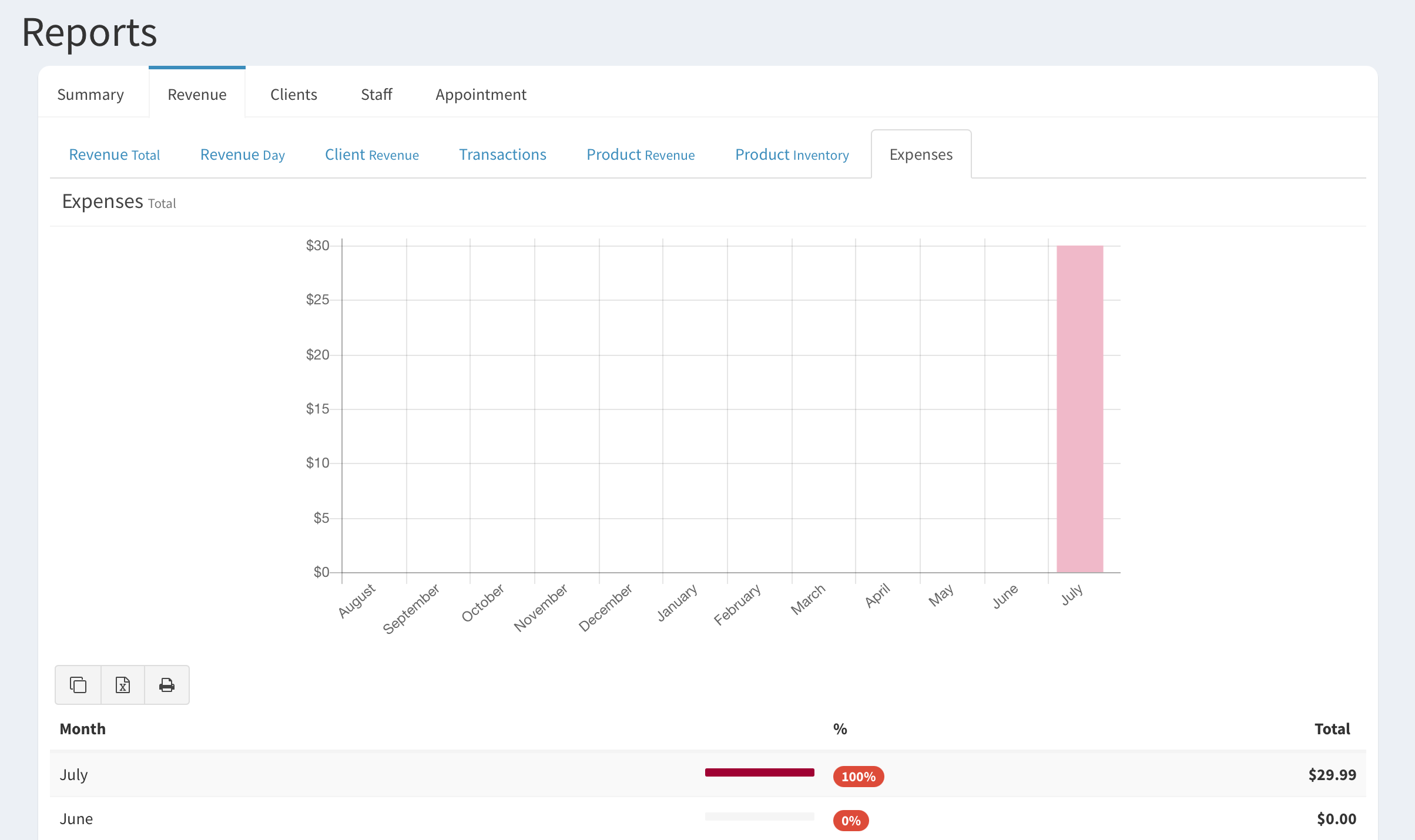 To view reports for expenses on any time period visit the Reports > Revenue > Expenses