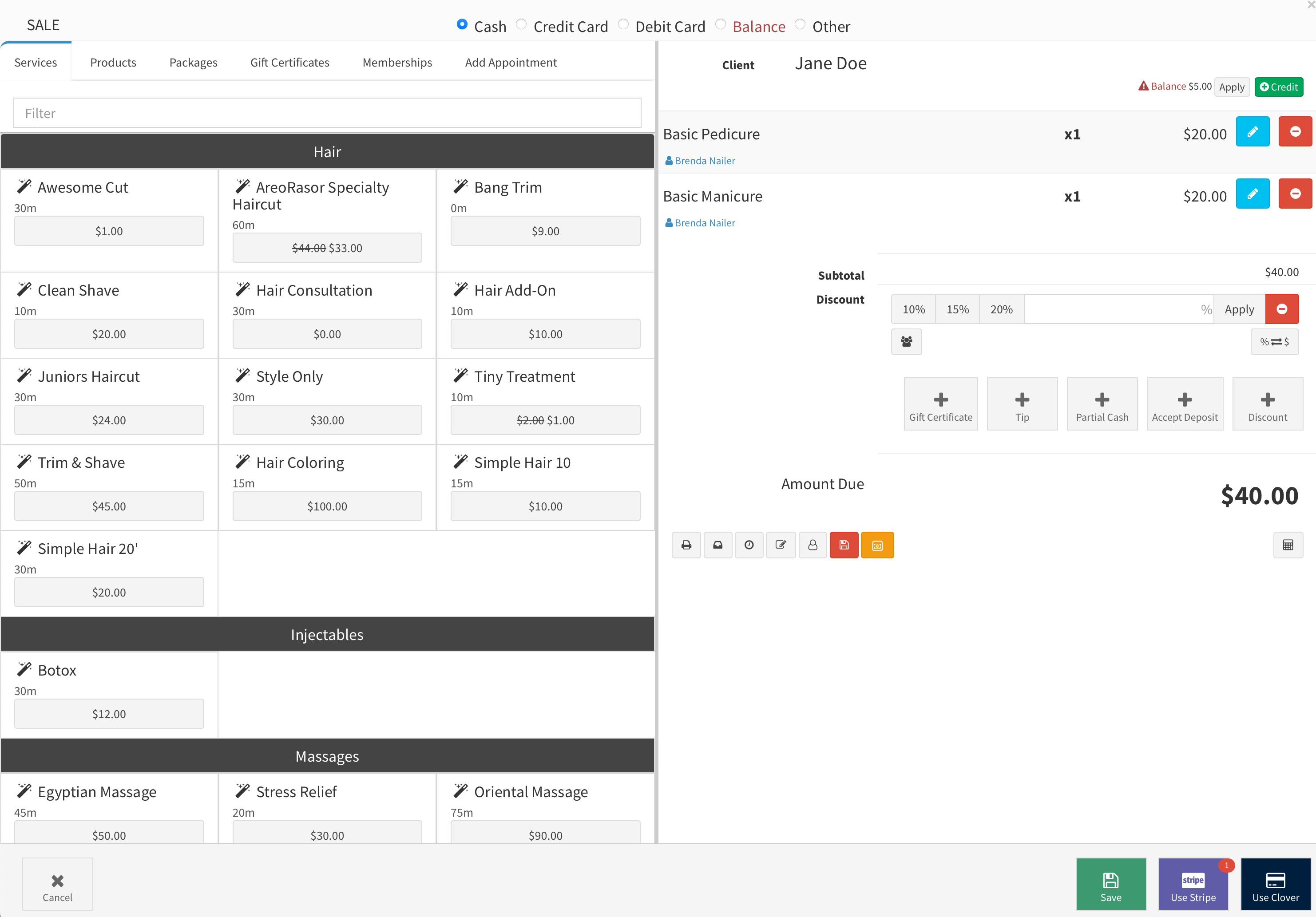 Walk-in **Make a Sale** Just like an appointment, but here you can set the client information, and select any services, products, gift certificates and packages the client may want to purchase. This is used for clients coming for a purchase without an appointment.