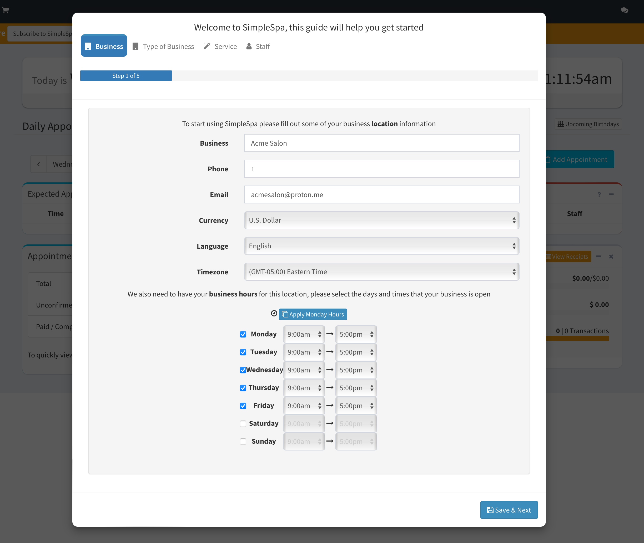 <figure><img src="https://695085455-files.gitbook.io/~/files/v0/b/gitbook-x-prod.appspot.com/o/spaces%2Fa9tSKQ7Cexg8YEba5Evb%2Fuploads%2FdOBJNXIVklNg6So0MEGb%2FScreenshot%202024-07-03%20at%2011.11.55%E2%80%AFAM.png?alt=media&#x26;token=5d2608ad-2c0e-493e-a5a6-b50790cc0872" alt=""><figcaption><p>SimpleSpa Setup Guide - Step 1<br>Adding business information via the Wizard</p></figcaption></figure>
