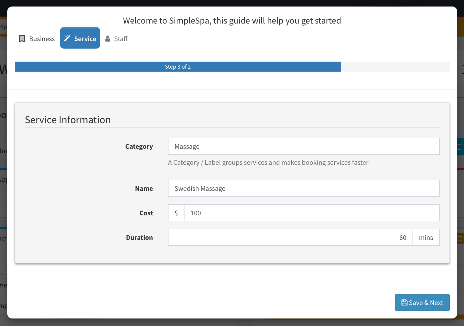 Upon signing up for SimpleSpa, a guided wizard will assist you in promptly inputting your business information, followed by the setup of your initial services and staff members within the system. This expedited process enables you to swiftly navigate to the appointments page and effortlessly make your first booking.